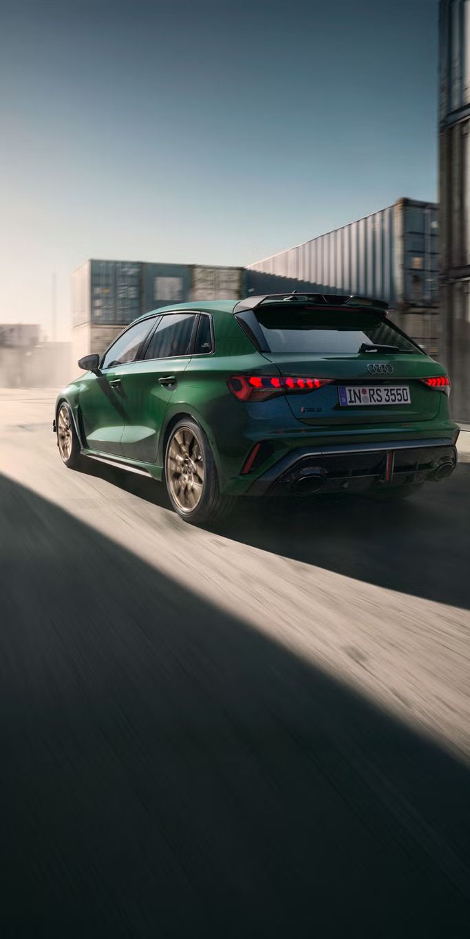 Der RS 3 competition limited7, 4: Anbauteile in Carbon matt treffen auf ausdrucksstarke Außenfarben in Malachitgrün Uni5, Daytonagrau Perleffekt oder Gletscherweiß Polarmatteffekt5. Für sportliches Fahrverhalten sorgt das Gewindefahrwerk mit neuem Hinterachsstabilisator, das spezifisch für die Sonderedition konstruiert wurde.