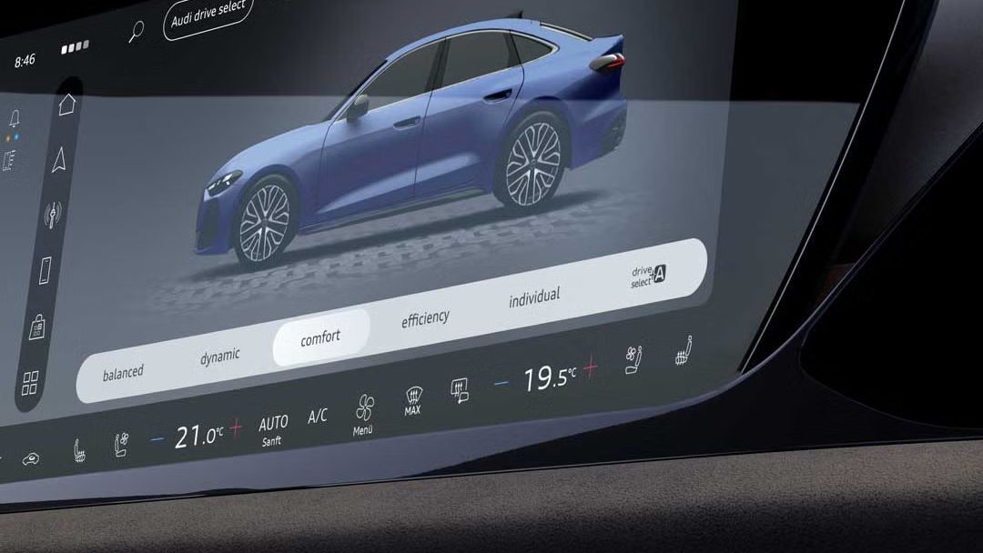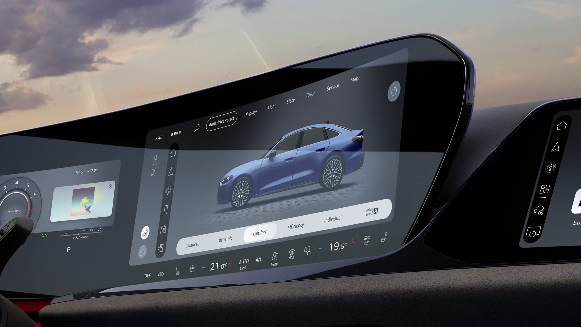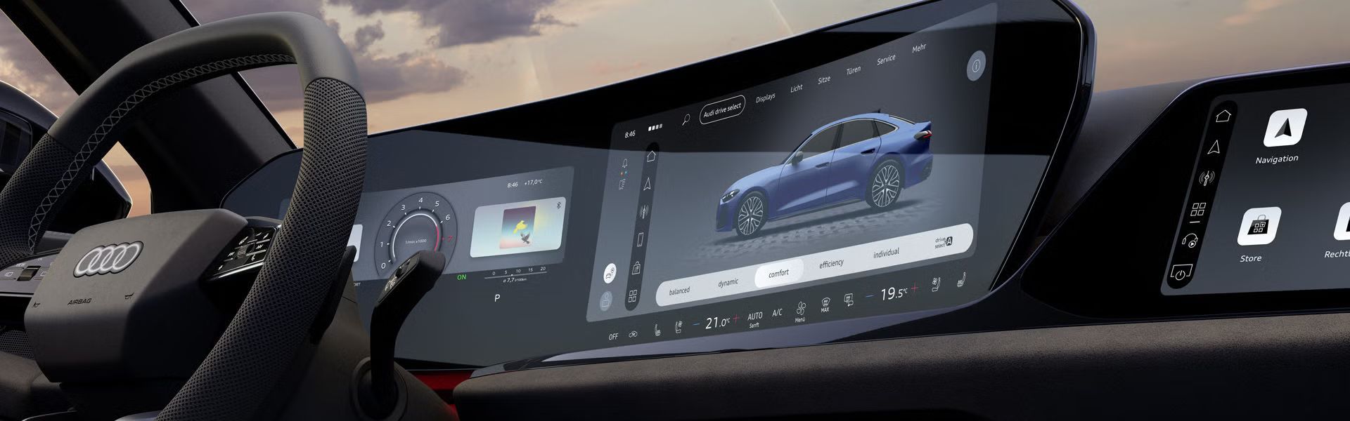 Das geschwungene OLED-Panoramadisplay, bestehend aus dem Audi virtual cockpit plus und dem MMI touch-Display, wendet sich ganz dem Fahrer zu. In Kombination mit dem MMI Beifahrerdisplay3,4,5 können z. B. Navigation und Entertainment getrennt voneinander bedient werden.