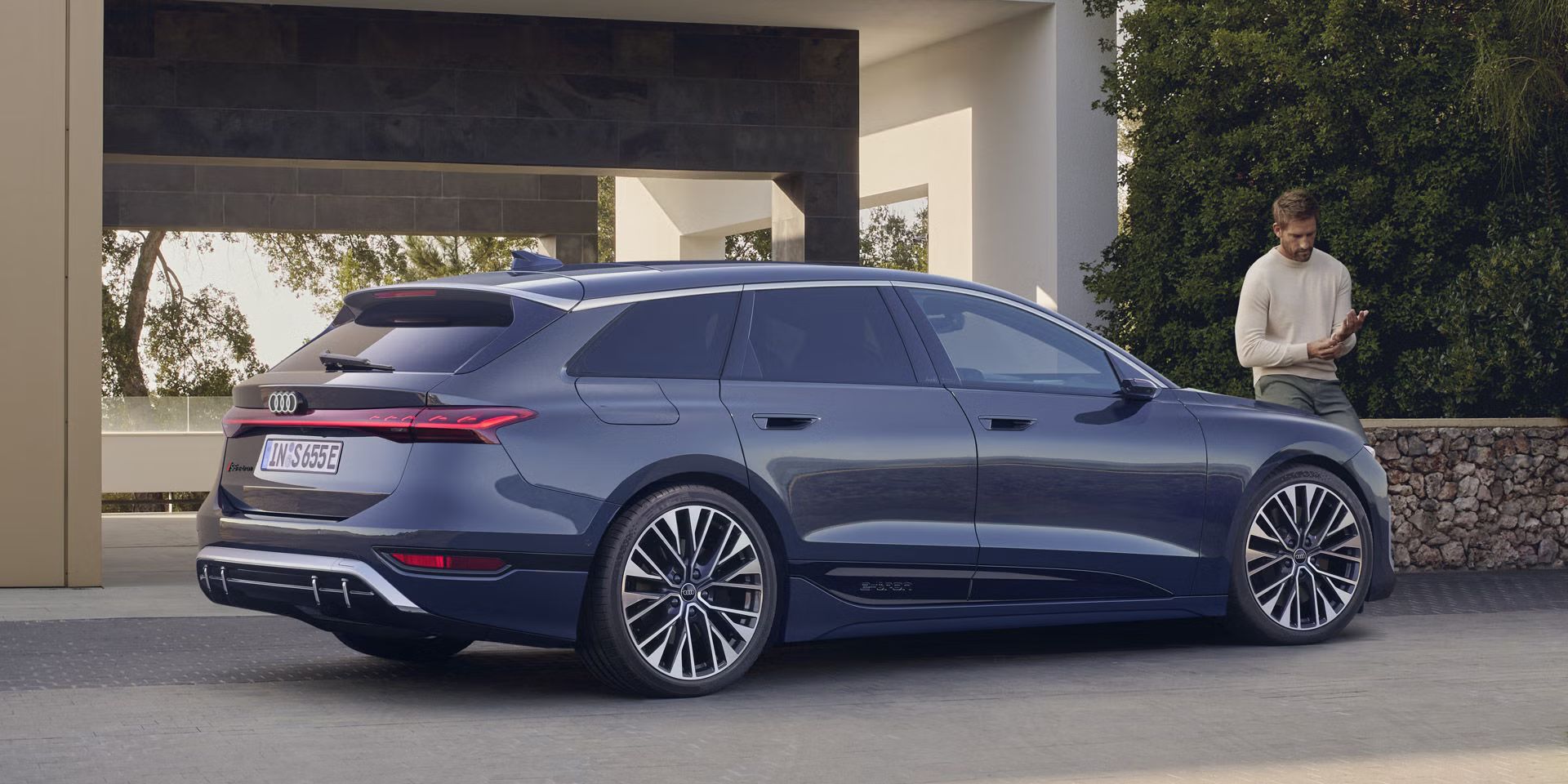 Seitliche Heckansicht eines fahrenden Audi A6 e-tron