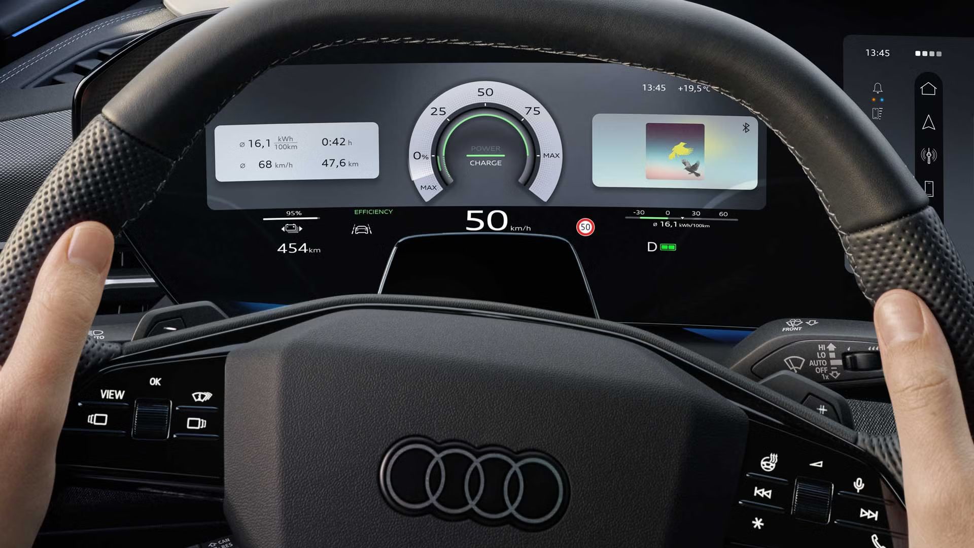 Ihr Audi gewinnt Energie zurück. Das Rekuperationssystem nutzt Brems- sowie Schubvorgänge und lässt sich manuell über die Lenkradwippen in drei Stufen einstellen.