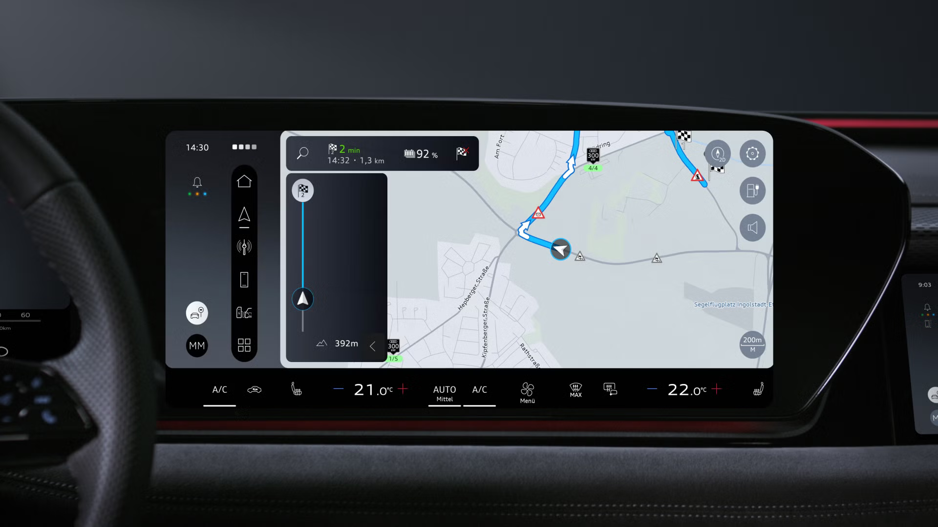 Dein Audi warnt dich aufgrund von Daten anderer Fahrzeuge vor Gefahren auf deiner Strecke. Das bedeuten die Warnsymbole.