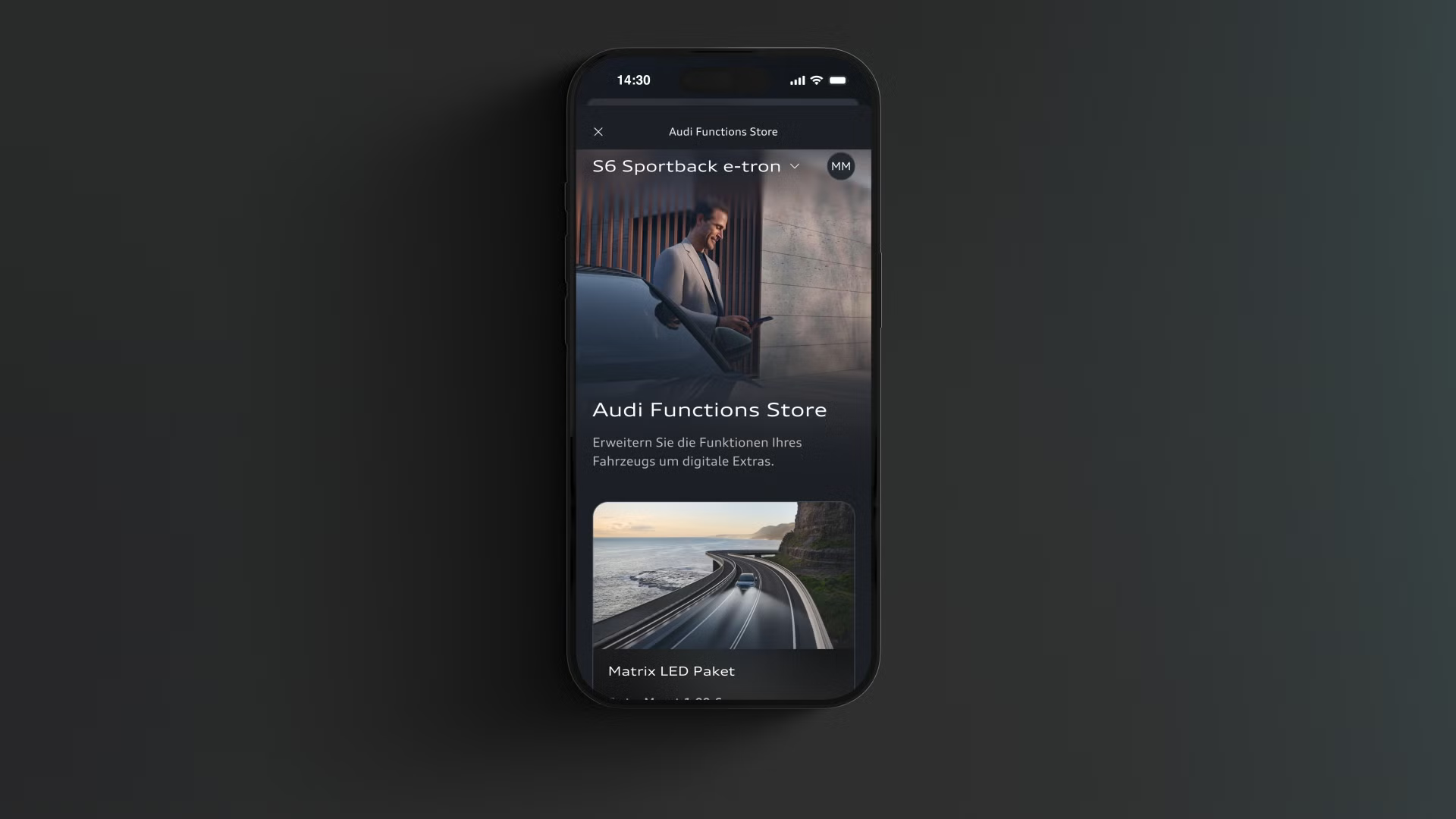 Im Audi Functions Store1 in der myAudi App2 erhältst du zusätzliche Funktionen für deinen Audi, die du nach Bedarf buchen kannst. Sieh nach, welche spannenden Optionen wie Matrix LED-Scheinwerfer3 oder der adaptive Geschwindigkeitsassistent4 für dein Modell verfügbar sind. Das Tutorial führt dich durch den gesamten Kaufprozess. Wähle deine Laufzeiten aus, gib deine Rechnungsdaten ein und hinterlege deine Bezahldaten für zukünftige Käufe.