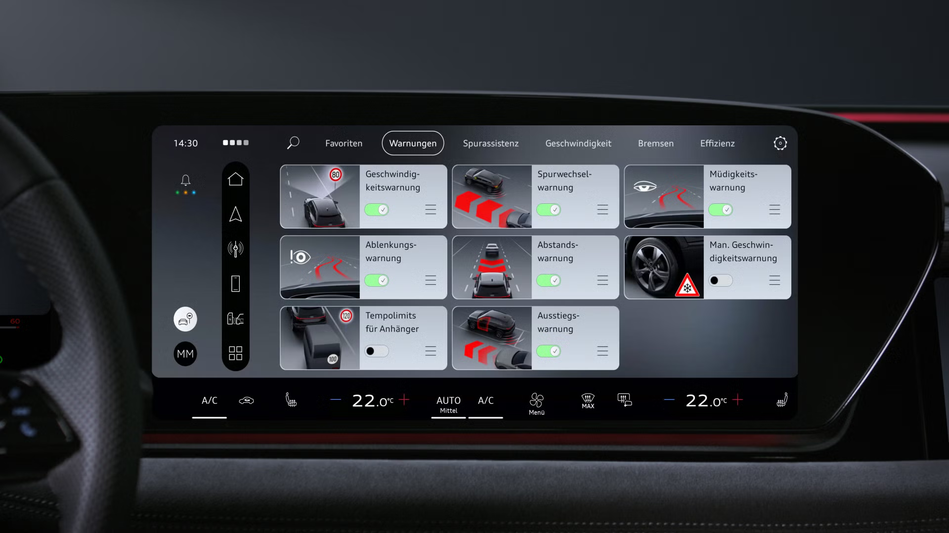 Dein Audi2 unterstützt dich mit zahlreichen Fahrerassistenzsystemen1 für mehr Sicherheit und Komfort. Im MMI hast du sie alle im Blick. Passe sie dort ganz einfach an deine Bedürfnisse an. Du erhältst eine Warnmeldung, wenn eine Funktion gerade nicht verfügbar ist. Mit wenigen Klicks siehst du im Warnspeicher alle gesammelten Hinweise und behältst so den Überblick.