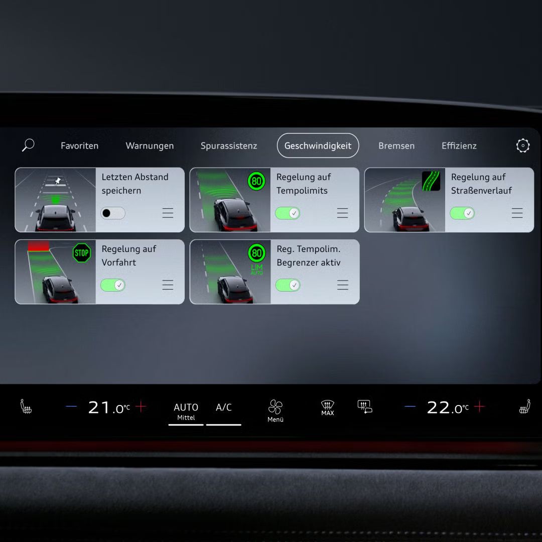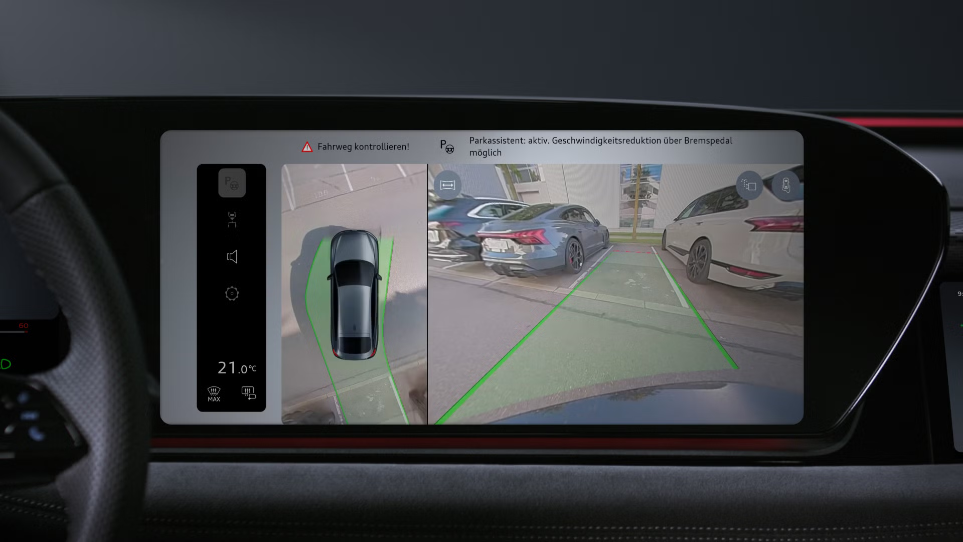 Der Parkassistent plus1,2 hilft dir beim Finden einer geeigneten Parklücke und übernimmt das Ein- und Ausparken nahezu selbstständig. Bei langsamer Fahrt sucht das System nach passenden Quer- oder Längsparklücken. Hast du dich für eine Lücke entschieden, kann dein Audi für dich einparken. Bei Längsparklücken kann das Assistenzsystem1,2 auch für dich ausparken.