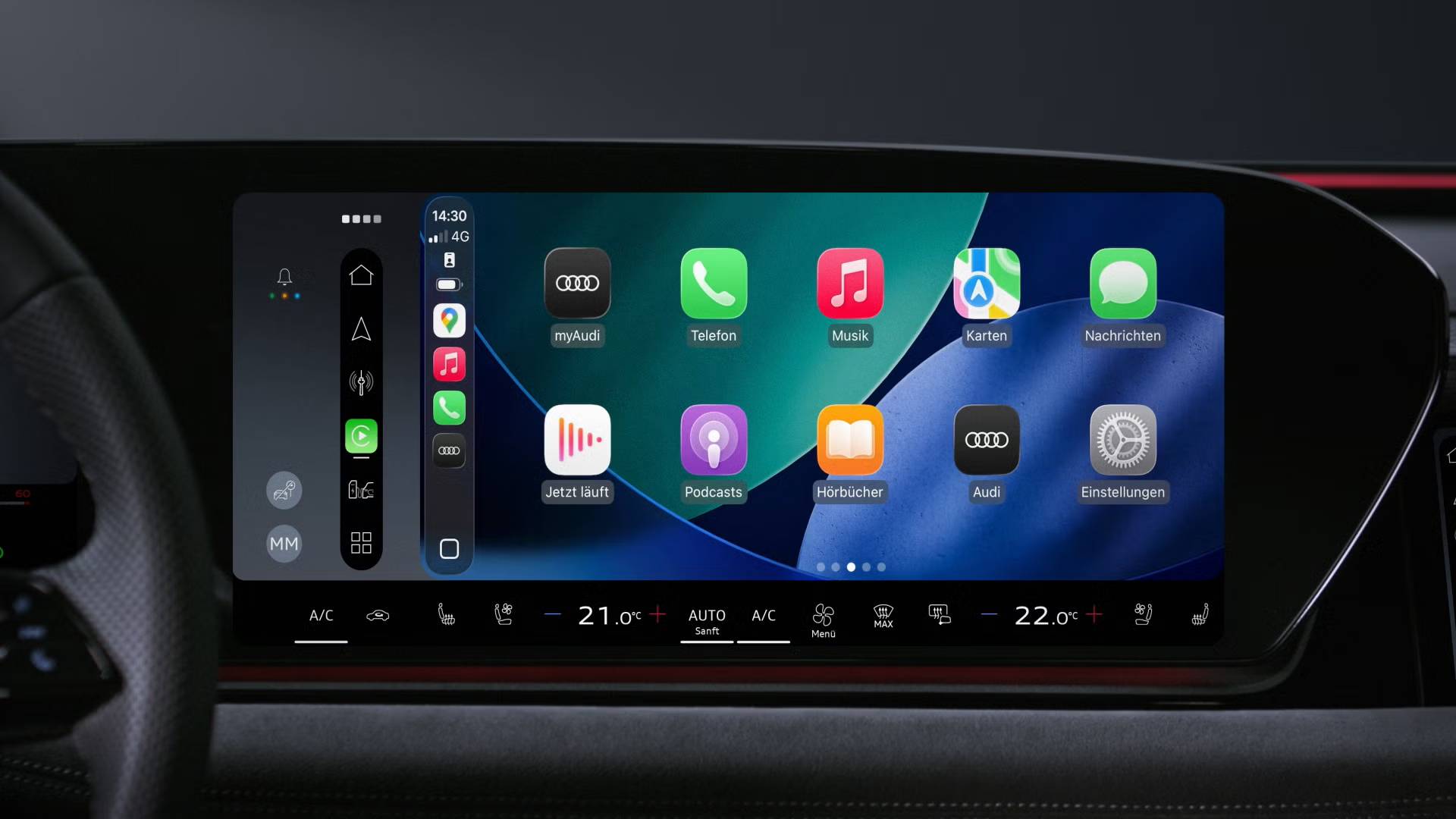 Nutze die myAudi App2 direkt über Apple CarPlay1. Greife auf Radiosender, Klimatisierung, Apple Music3 oder Ambientebeleuchtung4 zu – alles in einer Anwendung. Ordne das Dashboard ganz nach deinen Wünschen an.